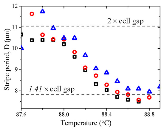 The observed stripe periodicity in a twisted cell as a function of temperature on cooling. Material used is MGTP7. The cell gap d = 5.53 µm, of a commercial EHC® 90° twist-aligned cell. Different symbols indicate the data collected from three different locations in the sample.