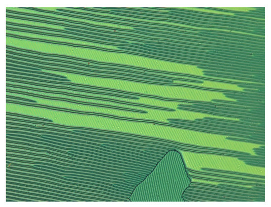 The results of the electro-optical experiment clearly confirm that the domain of a nematic phase in an LC cell under the field of view of a microscope is of single chirality [16,18]. Furthermore, the domain exhibits unusually fast electro-optic dynamics. To determine how such a chiral domain originated in the cell in the first instance, we examine the emergence of the domains observed under the polarising microscope in greater detail (Figure 4). The domain boundaries are identified as ‘discontinuities’ in a spontaneous emergence of the stripe pattern [15,16,17,18]. The two neighbouring domains gave an opposite switching response to the electric field applied [16,17,18]. The overall symmetry of the sample is consistent with the achiral nature of the material in a planar-aligned cell if the chiral domains of opposite chirality in a nematic phase also appear in the cell. The phase in question was proven to be nematic by X-ray scattering, as already been stated [15,19]. Such observations were repeatable and reproducible for the compounds and the mixtures, composed of achiral molecules, investigated as listed in Figure 2.