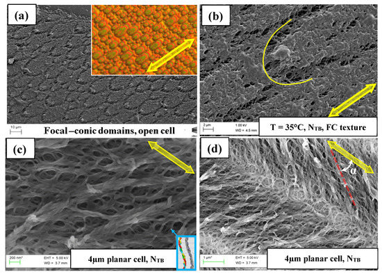 Figure 14. The hierarchy of structures seen by the SEM images. Yellow arrows indicate the rubbing direction. (a,b) Focal conic domains in the open cell. (a) The scale bar is 10 µm. Colour inset—similar pattern in 13 µm-thick planar cell under POM. (b) The scale bar is 2µm. Yellow line highlights the boundary of a single focal conic domain. (c,d) 4µm-thick planar cell. The scale bar is 200 nm in (c). Detailed images show submicron structures. A small white dot at the tip of the pale blue arrow corresponds approximately to the size of 8 nm helical pitch discussed in [41]. (d) The scale bar is 1µm. Wider field of view image of the same sample shows a fragment of self-deformation (double cell gap) stripe and fish-bone texture that forms it. We define α as a ‘fish-bone angle’ [28]. - Sandwiched cell: In this case, a standard commercial sandwich cell is used. The cell is filled with the mixture and is polymerised in the phase/texture of interest. Though we avoid some of the drawbacks of the first method, nevertheless, this technique may damage the structure of the phase in the sponge itself while the two substrates are pulled mechanically apart. However, we do expect that the polymer template retains the structure of the phase of interest in the middle of the cell. The structure corresponding to the NTB so formed is imaged by SEM, and images are shown in Figure 14c,d, the former scanned with a higher magnification of SEM than the latter.