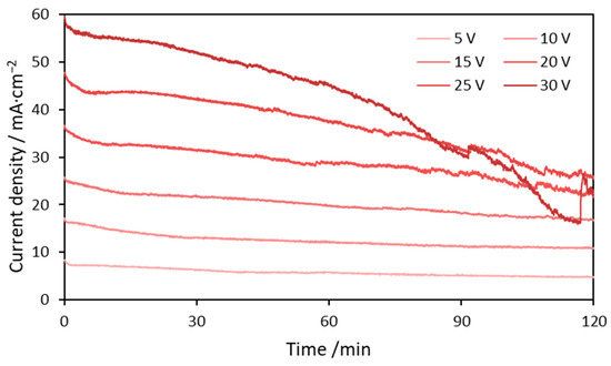 It is apparent that during the first 2 min there is a rapid drop in current density followed by short plateau (especially for greater voltages). Presumably, in this initial phase, anodic oxide coats the entire Cu surface. According to Giri and Sarkar [36], electrochemical oxidation of copper might lead to the formation of Cu2O and CuO, where CuO could be generated through both copper and Cu2O oxidation. Thus, it can be stated, Cu2O formation is the first stage of copper anodizing, and can be represented by following electrochemical and chemical reactions (Equations (1)–(3)) [36]: