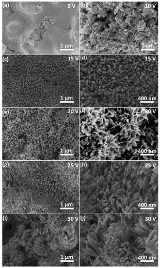 Greater magnifications show that the formed nanowires are densely packed, which makes them promising morphology for all the applications, where high surface area is demanded, i.e., catalysis (Figure 2c–j). For samples prepared at 25 and 30 V FE-SEM imaging showed that the nanowires tend to form bundles (Figure 2g–j).