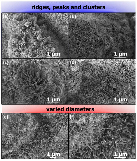 Additionally, observation of numerous random areas of the samples revealed that the tensions on the surface of the growing anodic nanostructures are so high that the nanowires form various ridges (Figure 3a,b), peaks (Figure 3c) and clusters (Figure 3d). Therefore, such high stresses would rather ease partial dissolution or detachment of the grown oxide. What is even more interesting, certain random zones of the oxidized sample with bimodal distribution of nanowires were found (Figure 3e,f).