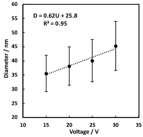Diameter of the nanostructures grows with voltage linearly up to 30 V (Figure 4, Figures S3 and Figure S5). The diameter increases with applied voltage in a range of 15 V (35 ± 6 nm) to 30 V (45 ± 9 nm). At voltage higher than the 30 V average diameter of nanowires decreases (Figure 4 and Figure S3) due to detachment and regrowth phenomena. Simultaneously, for samples prepared at 35 and 40 V, the current density transients show strong oscillations, which confirms occurrence of numerous consecutive detachment-regrowth cycles Presence of both original and regrown nanowires in samples prepared at higher voltage lowers the average nanowire diameter as compared to nanowires in samples anodized at lower voltages.