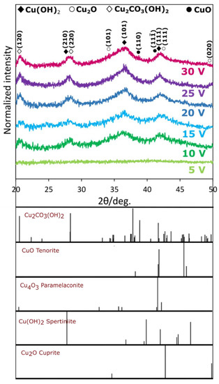 It is apparent that for samples anodized at 5 V no crystalline structures were formed. This is in line with FE-SEM observations, where no actual nanostructures were revealed (see Figure 2a). In other cases, also at the highest voltages (35–40 V; see—Figure S5) reflexes originating from monoclinic tenorite (CuO) and cubic cuprite (Cu2O) were found, confirming suggested mechanisms of formation. What is quite uncommon, three reflexes originating from Cu(OH)2 were found in the XRD pattern. Despite the reflexes have low intensity and width, the most distinct ones originate from Cu(OH)2. There are literature reports in which Cu(OH)2 is also found to be crystalline. However, there are numerous cases when only oxides (Cu2O and CuO) were formed by anodizing and passivation in NaOH [38]. On the other hand, according to Zhang and Wang, nanostructures formed by anodizing in NaOH consisted of crystalline Cu(OH)2 and reflexes from tenorite appeared after calcination, i.e., after thermal Cu(OH)2 decomposition into CuO and water [39]. So already at this point, the reported data were found to be unequivocal. Similarly, contradictory data were reported for copper electrochemical oxidation in KOH. For example Wu et al. [40] and Cheng et al. [12] obtained nanostructures that were made of crystalline Cu(OH)2 using galvanostatic passivation in 2 M KOH at 1.5 mA·cm−2. In order to obtain any reflexes from CuO, the samples were annealed for 3 h at 150 °C or 200 °C [40]. On the contrary, Xiao et al. reported formation of Cu2O and CuO, in 0.5–2.0 M KOH at 0.5–4.0 mA·cm−2, as the only crystalline phases [11].