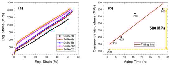 - The compressive yield stress of the 945A Ni-based superalloy was significantly improved by the increase in aging time. Compressive yield stress increased from 229 to 809 MPa, an increase of more than 220%.