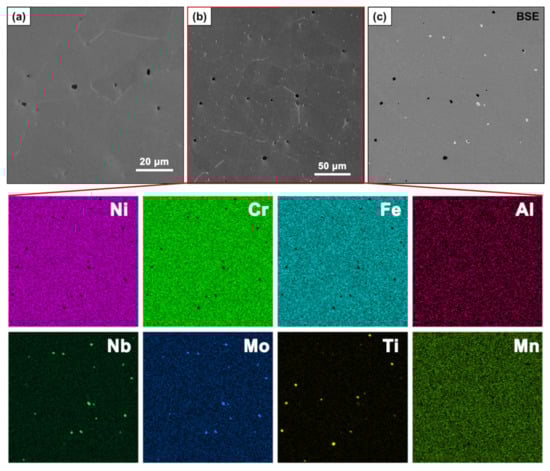 The SEM results of the non-heat-treated and 945A-32h samples are shown in Figure 2. In Figure 2a, some coarse second-phase particles could be found in the non-heat-treated sample. With the increase in aging time, both coarse and fine particles were observed in the 945A-32h samples (Figure 2b). The coarse particles could be divided into two types: one type exhibited a black square shape and the other, a white square shape, as shown in the backscattered electron (BSE) results of Figure 2c. According to the EDS mapping analysis results, the black square shaped particles were enriched with Ti, and the white square shaped particles were enriched with Nb and Mo. These coarse particles were most apparent in the micron scale and were considered to be carbides or nitrides. The coarse particles were thermally stable and still existed after solid solution treatment [20,21]. According to Saleem et al. [19], these black square-shaped particles enriched with Ti were TiN. The white square shaped particles were considered to be carbide. The fine particles, were mainly at the nanoscale and too small to identify with the SEM.