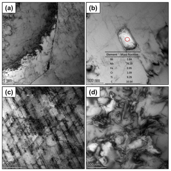 Figure 3 shows the TEM images of the 945A-32h sample. After the plastic processes, many dislocations were formed in the matrix, as shown in Figure 3a. Meanwhile, particles with a size of ~200 nm could be found on the matrix, as shown in Figure 3b. According to the EDS point analysis results in Figure 3b, the particles were mainly enriched by Nb, Ti and C, which was considered a carbide. Residual dislocations were divided into two types. One was a movable dislocation, which appeared as banding. The other was a dislocation entanglement region, characterized by high strain. These dislocation lines and the high-strain region were beneficial to the formation of the precipitated phase.