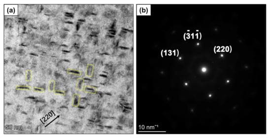 Meanwhile, many nanoscale precipitates were observed in Figure 4. The size of the precipitates was 10–20 nm and the space between these precipitates was 5–10 nm. Such a high density of precipitates illustrated that a large fraction of the solid alloy was precipitated. Under the spatial axis of (220), two different direction distributions of the precipitates were found. These two directions were perpendicular to each other as marked by the yellow box. According to the literature [22], precipitates with such a microstructure in 945 Ni-based alloys are considered to be phase. The phase was precipitated on the (110) plane of the matrix. The high density of the phase is beneficial in improving the mechanical properties after aging treatment.