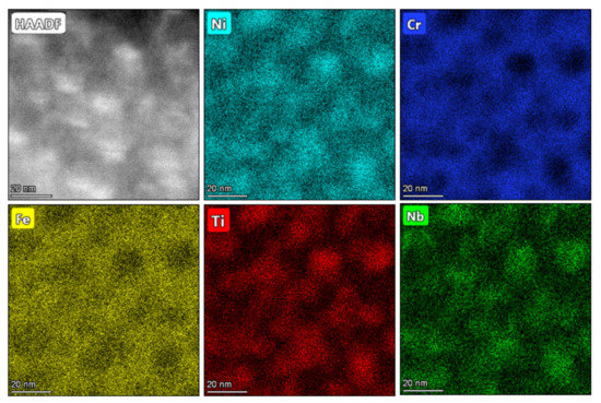 In order to identify the precipitation behavior of the phase, high-angle annular dark field scanning transmission electron microscopy (HAADF-STEM) was employed to analyze the microstructure and the element composition of the phase. Figure 5 shows the HAADF-STEM image and the EDS mapping distribution of phase in the 945A-32h sample. In the HAADF-STEM image, the phase particles present as the white square shapes, and the matrix as the dark background. According to the EDS mapping distributions, these white square particles are enriched with Ni, Ti and Nb. The distributions of these precipitates were parallel to each other, which was consistent with the results in Figure 4. A similar distribution was found in an investigation of ATI 718Plus [23], which was aged at a different temperature (675 °C for 8 h and 788 °C for 4 h).