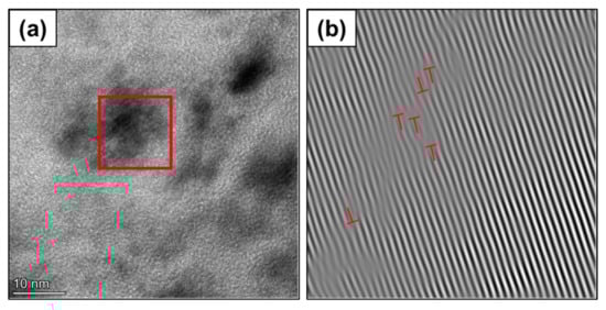 Moreover, the sample in this study was in the wrought condition, which contained many dislocations and deformed regions in the microstructure. During the aging treatment, dislocations and the high strain region are beneficial to stimulate the formation of precipitates. A similar element segregation behavior at defects has been reported in Al and Mg alloys [26,27]. High-resolution TEM analysis was employed to clarify the interaction between the dislocations and the element segregation in the 945A-32h sample. The relevant high-resolution TEM image and the inverse Fourier transform (FFT) image are displayed in Figure 6. There were many dislocations in the element segregation region. The existence of edge-type dislocations (marked with “T” symbols) can be clearly seen in Figure 6b. This suggests that element segregation was more likely to occur near dislocations. In the subsequent heat-treatment process, these elements were precipitated in the segregation region, resulting in fine and dispersed precipitates. Since the dislocation distribution was striped and crossed, these precipitates also tended to be perpendicular to each other after precipitation. This was why the precipitates in Figure 4 were perpendicular to each other. The distribution of the precipitates was conducive to hindering the dislocation movement in subsequent plastic deformation processes.