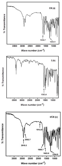 The non-mesomorphic nitrogen-based component was prepared by the condensation of 3-pyridine carbaldehyde with arylamines. The Schiff bases were utilized to prepare the supramolecular hydrogen-bonded complexes ((I–V)Cn). Each Schiff base was mixed with the corresponding alkoxy benzoic acid in a 1:1 molar ratio at a particular chain length (n = 8, and 16). The formations of the complexes were proven by FT–IR and nuclear magnetic resonance (NMR) spectral analyses [52,53,54,55,56]. However, the FT–IR measurements proved to be an effective tool for such confirmations [56,57,58,59,60]. The spectral data of the compounds (C8, I), and I/C8 were measured, as shown in Figure 1a–c, where C8, I, and II/C8 represent p-octyloxybenzoic acid, the Me Schiff base, and the complex, respectively.
