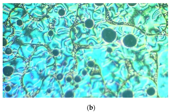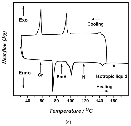 The results of the differential scanning calorimetry (DSC) of LCs, even for those produced through supramolecular assemblies, generally featured relatively high enthalpy changes (ΔH), accompanied by crystalline mesomorphic transitions (20–100 kJ/mol) [41,42,43,44,45,46,47]. However, the literature reports some examples in which the ΔH values during melting were lower than 10 kJ/mol [48,49,50,51].
