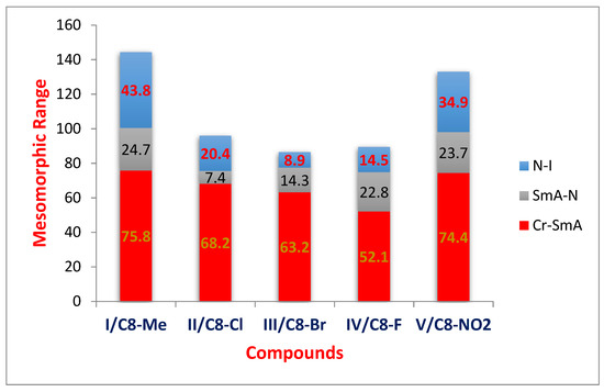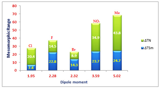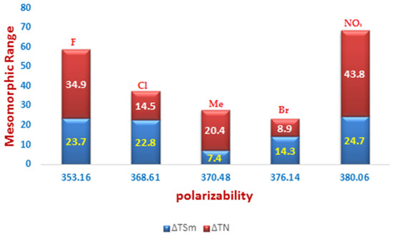 Figure 7 reveals the effect of polarizability on Ts of the analogous series, (I-V)C8. The increases in the polarizabilities evidently reduced the total mesomorphic range (except that of the highly electron-withdrawing nitro group). This could be elucidated regarding the co-effectiveness of other factors, such as the dipole moment of the overall behavior. However, regarding the halides, the increase in the polarizability successfully reduced the nematic and smectic mesophase ranges.