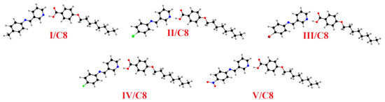 Recently, we employed theoretical calculations to correlate experimental ones regarding liquid crystalline materials [62,63,64,65,66,67,68,69,70,71,72,73]. Thus, DFT calculations were conducted for the basis set, B3LYP 6-311g (d, p), for all the supramolecular analogous series of the complexes that were prepared with p-octyloxy benzoic acid ((I–V)C8). B3LYP level with the 6-311G (d, p) basis set is reasonable for molecular investigation of liquid crystalline materials [74,75,76,77]. The optimized geometrical structures of the investigated compounds were measured in the gas phase, employing Gaussian 9. To determine the lowest-energy geometries, structural optimization was employed to optimize all the compounds. This optimization method was applied to determine the geometrical structures of the lowest energy conformations of the compounds until a new lowest-energy geometrical structure, which is known as the convergence, was generated. Thereafter, the optimized structures were employed to measure the frequency and several significant thermodynamic parameters. The optimized molecular structures of the compounds were stable because of the absence of an imaginary frequency, as shown in Figure 4. Further, the non-coplanar structures (with a bent shape due to lateral hydrogen bonding and the twist angle of the Schiff base) of the pyridine CH=N bond were determined as the approximate molecular geometry. This twist angle was clearly influenced by the duration and electronic existence of the polar groups, as well as the degree of the extra conjugation in the structure. The highly electron-withdrawing nitro group of the V/C8 derivative exhibited the highest bent-shape angle between the acid and pyridine ring (ᴓ = 129.1°), which could be demonstrated regarding the electron attraction ability of the nitro group, which also decreased the strength of hydrogen bonding (the length of the hydrogen bond was 1.655 Å). Conversely, Compound IV/C8 bearing the compact fluorine atom possessed a bent-shape angle of ᴓ = 127.7°: the larger the halide atom, the larger the reported bent angle (ᴓ = 128.2° and 128.9° for the chloro and bromo derivatives, respectively).