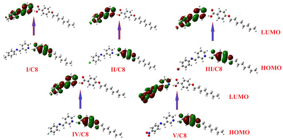 Table 2 and Figure 5 present the expected plots of FMOs (highest occupied MO (HOMO) and lowest unoccupied MO (LUMO)) of the prepared compounds, (I–V)C8. Figure 6 reveals that the electron densities of the sites, which were involved in the formations of LUMOs, as well as the aromatic ring of alkoxybenzoic acid, which was involved in the formation of HOMOs, were localized on the pyridyl component. Conversely, the electron densities of FMOs were unaffected by the polar groups. Moreover, the presence of the polar groups exerted a major impact on the energy gap of FMOs. The FMO levels were affected by the attachment of the polar groups. Conversely, the V/C8 nitro derivative exerted the same effect. Dissimilar to the other groups, the addition of an electron to the withdrawing NO2 group reduced the HOMO and LUMO levels. The energy difference was minimized by the extra-conjugated nitro group. The co-planarity of the nitro group increased and caused an extra conjugation of the aromatic rings and a decrease in the energy gap of FMOs.