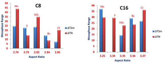 Figure 8 shows the relationship of calculated aspect ratios and mesophase range for the C8 and C16 analogous series, (I-V)C8 and (I-V)C16. The variation of the aspect ratio with respect to the chain length is not systematic either for the smectic or the nematic mesophase ranges. This result could be illustrated in terms of the accumulative effects of other factors such as the dipole moment, polarizability, etc., that could act together to show the enhanced mesophase range.