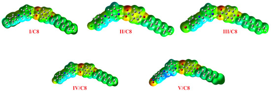 The charge-distribution map of the prepared para-octyloxy benzoic acid-derived supramolecular complexes (I-V)C8 was calculated by the same approach employing the same basis sets according to MEP (Figure 9). The hydrogen-bonded component of the supramolecular complexes was assumed to be located in the region where the negatively charged atomic sites (the red region) were concentrated. However, it was predicted that the alkoxy chain moieties possessed the least negatively charged atomic sites regardless of the composition of the attached polar groups (the blue regions). The predicted charge-distribution maps might indicate the formation of the LC-enhanced mesophase.
