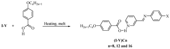 All the chemicals (>98% pure) were purchased from TCI Company, Japan. The Schiff bases were prepared and recrystallized two times from an ethanol/water mixture, after which their purities were confirmed by thin-layer chromatography (TLC) (Scheme 1). Finally, the supramolecular complexes were prepared by mixing equimolar ratios of a particular Schiff base with para-alkoxy benzoic acid, followed by melting to ensure the formation of the complexes (Scheme 2).