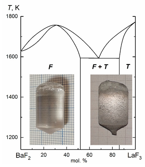 Wide areas of solid solutions with a fluorite-type (sp. gr. Fm-3m) structure Ba1–xLaxF2+x (0 ≤ x ≤ 0.52) and with a tysonite-type (sp. gr. P-3c1) structure La1–yBayF3–y (0 ≤ y ≤ 0.14) are formed in a condensed system BaF2–LaF3 (Figure 1) [1]. These solid solutions demonstrate high stability to degradation; therefore, there is a possibility of growing both fluorite and tysonite single crystals from a melt in a wide concentration range. Heterovalent solid solutions Ba1–xLaxF2+x [2] and La1–yBayF3–y are promising optical materials with variable properties due to the changeable composition. Their high fluorine-ionic conductivity σdc is especially attractive. [3,4,5,6,7]. They have very low electronic conductivity [8,9] and therefore are effective fluorine-conducting solid electrolytes. The method of growing fluorite-type crystals Ba1–xLaxF2+x is well developed, and their electrophysical properties have been studied in detail [3,4,5,6,7,10,11]. Tysonite La1–yBayF3–y crystals have higher conductometric characteristics than Ba1–xLaxF2+x, but the conditions for their preparation and properties have been studied much less. At the present time, the solid electrolyte La1–yBayF3–y in terms of the set of performance characteristics has been proposed for use in the designs of the prototypes of fluorine-ion current sources of a new generation [12,13,14,15,16].