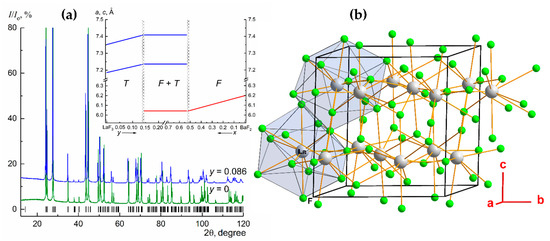 XRD patterns of La1–yBayF3–y crystal for selected y fraction (a). The positions of the Bragg reflections are indicated for sp. gr. P-3c1 with unit cell parameters a = 7.1832(1), c = 7.3493(1) Å. Inset: concentration dependence of the lattice parameters of the La1–yBayF3–y and Ba1–xLaxF2+x solid solutions [11]. The data for the Ba1–xLaxF2+x solid solution are presented for comparison. A perspective view of the LaF3 tysonite crystal structure. Polyhedra for the La3+ cations are presented (b).