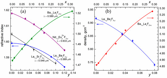 The concentration dependencies of the refractive indices (a) and densities (b) of the La1–yBayF3–y and some selected tysonite-type crystals. The data for the fluorite Ba1–xLaxF2+x solid solution are presented for comparison.