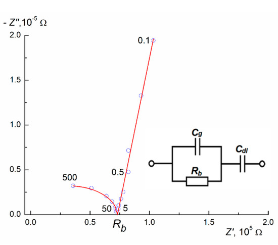 The bulk resistance Rb was found from the intersection of the hodograph Z*(ω) with the abscissa axis. Specific static electrical conductivity σdc was calculated by the formula: