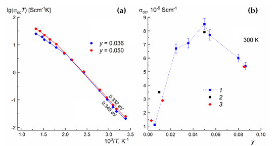 The coordinates of the conductivity maximum were σmax = 8.5 × 10–5 S/cm and ymax = 0.05 ± 0.01. The minimum activation enthalpy ΔHσ = 0.33 eV (low-temperature segment σdc(T)) corresponded to the maximum conducting composition ymax.