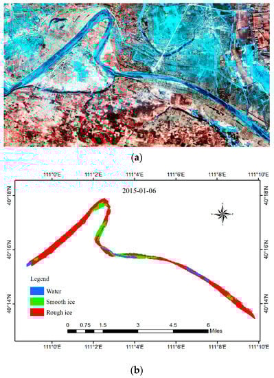 (2) Remote sensing monitoring data. The Landsat 8 on-board OLI sensor launched in February 2013 provides imagery with 12-bit radiometric, 16 days temporal resolution, and 30 m spatial resolution, including a 15 m panchromatic band have been used in this paper. The large-scale river ice process, ice type, and channel evolution are obtained from Landsat 8 images during 5 December, 21 December 2014, and 6 January, 7 February 2015. The Landsat data in 1995 (TM), 1999 (ETM), 2006 (TM), and 2013 (OLI-TIRS) of the research areas are also used to study the channel evolution. As an ally, ENVI 4.7 image processing system often serves as a tool for remote sensing image interpretation. Specifically, it includes four key steps of image cut, color composite, image enhancement, and pre-treatment technique, in which extracting long-sequence river ice information is now possible. The reflectance of ice in the visible and near-infrared is significantly greater than the reflectance of water [18], and the greater roughness of the ice body compared to the water is correlated with a smaller reflectivity of solar radiation. Under the optimal band combination of B743, water and ice can be identified via radiation brightness in the image, i.e., it can be split into static ice (flat ice) and dynamic ice (rough ice). For this purpose, the maximal likelihood method is normally used to classify ice and water, and then vectorize raster data retrieved from classification. The root mean square error is controlled within one pixel, and the average relative error is about 10% within the acceptable range. The original satellite image and the interpreted image comparison of the Shensifenzi section are shown in Figure 2.