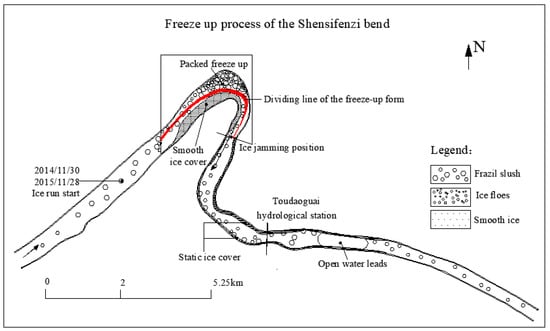 The bend is known as one of the common locations for the initiation ice jam affected by the flow characteristics and the channel curvature; the flow structure under the ice cover or jam is of more complexity influenced by many factors, e.g., boundary conditions and thermal regime [24]. The thickened ice cover is the basis of the accumulation of frazil slush and floes during freeze-up period, and the Froude number at the leading edge of the ice cover determines the position and thickness of the freeze-up jam [20]. Naturally wide rivers exhibit mostly turbulent flow, and turbulent motion has a large influence on the transport of surface ice and undercover ice, especially in bends and narrow channels [25,26,27]. Based on the results of field monitoring and remote sensing image interpretation, the ice jam formation processes of the Shensifenzi bend can be summarized.