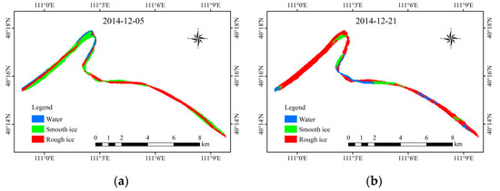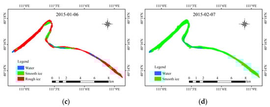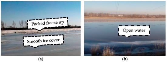 The interpreted length of Shensifenzi is 22.54 km—the ice and open water area variations and their proportion over time span indicate the river ice process of the bend. With continuous increases in ice thickness and variations in solar radiation intensity, the surface of the ice body exhibits freezing and thawing. Affected by the day and night temperature variations in Inner Mongolia, the surface ice cover will melt, due to heat absorption during the day, while the temperature drops at night, the meltwater on the top of the ice cover freezes up again, which makes the ice surface flat, as shown in Figure 5. At the end of the freeze-up, the open water area in the channel still exists.