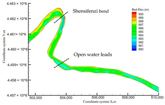 The transverse accumulation of frazil ice depends not only on hydraulic variables, but also on the central angle of the river bend [1]. Figure 6 shows the bed elevation distribution of the Shensifenzi section, which can be seen that the relatively lower bed elevation is near the outer bank of the first bend. Whereas, the second bend has the opposite trend in bed elevation, in which the flow direction slants to the outer bank in the upstream bend at the very start, and then inclines to the inner bank downstream. The bed elevation at the outlet of the first bend is the lowest in the research area, where the flow velocity is the smallest under the same flow condition, and frazil ice is easily accumulated here. After the initial ice jamming form, the hydraulic conditions in the channel will be changed.