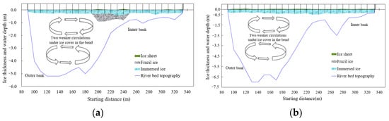 The distribution of water depth and ice condition of the Shensifenzi bend in (a) 18 December 2014 and (b) 2 January 2015.