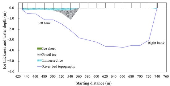 The ice floe from upstream can accumulate at the edge of the ice cover to form a new ice cover, but when the frazil ice discharge under the ice cover is greater than the frazil ice transport capacity of the river, the frazil ice will accumulate under the cover, and an initial hanging dam will be formed [38]. Influenced by the ice and the bed friction roughness, the frazil slush will accumulate in areas with a relatively shallow water depth, which reduces the wetted cross-sectional area and obstructs the flow, allowing more ice particles to form a large undercover ice deposition.
