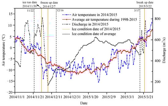 As discussed above, the river ice and ice jam formation processes in the bend are complex, especially in hydraulic and thermodynamic processes, since several factors have strong impacts on them, such as temperature, morphology, and flow discharge. The temperature is the basic factor to characterize the thermal and ice condition. During the freeze-up period, the water temperature reaches the freezing point, and the heat loss shows an opposite trend with the air temperature. Figure 9 shows the variation of the average daily temperature, the flow discharge, and the average air temperature for 17 years (1998–2015) of TDG station in the ice period of 2014–2015. Compared with the data for the last 18 years (vertical dashed line), the air temperature in November 2014–2015 is 1 °C greater, which decreases the ice floe density and postpones the initial ice concentration date by eight days. The relatively low temperature in December makes the freeze-up date move up by nine days, and the cumulative negative temperature in December reaches −301 °C. The cumulative negative temperature has a significantly negative correlation with the ice thickness [29,30]. The temperature during the freeze-up period has a significant decreasing trend, and the cumulative negative temperature in March is −42 °C lower than the average in this area. Relatively, thick ice and lower cumulative negative temperatures in March delay the ice breakup date by five days. In general, the thermodynamic characteristics are the key factors affecting ice production, channel freeze-up dates, and ice jam formation, and the heat transfer rate between water and atmosphere is mainly controlled by the difference between the air temperature and the water temperature [31,32]. The relatively low temperature in 2014–2015 of the Shensifenzi section is an important reason for the long-frozen duration.