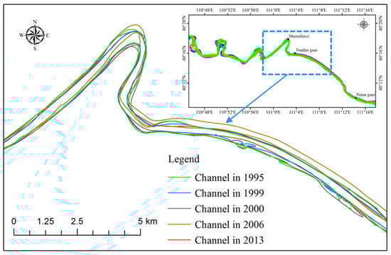 Channel evolution of research area and the enlarged view of Shensifenzi bend during 1995–2013.