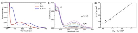 The absorption spectra of BU showed a weak peak at 320 nm, whereas ChA showed a characteristic peak at 460 nm (Figure 1a). Upon mixing BU and ChA, the absorption peak of the complex (BUChA) was observed at 570 nm (Figure 1a). Figure 1b shows the electronic absorption spectra of the successive addition of ChA to the BU solution at 25 °C. By adding the methanolic solution of ChA to the BU solution, a new absorption peak at 570 nm was observed in addition to the ChA peak at 370 nm. The color of the solution changed to purple with the ChA concentration increase. The appearance of the new broad peak at 570 nm at which neither BU nor ChA absorb was attributed to the stable charge-transfer complexes’ formation through radical anion formation [50,51]. The stoichiometric of the interaction between BU and ChA was determined by the Jobs method through monitoring the absorption spectra at the new 570 nm peak [52]. The deflection point at the 0.5 molar ratio indicated the 1:1 complex formation of BU and ChA in methanol (data not shown).