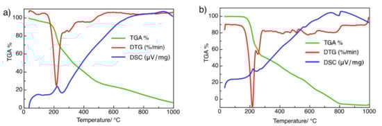 The solid complex BUChA was investigated by thermal analysis and FTIR spectroscopy. TGA-DSC of BU showed three weight loss steps. The total weight loss of 94% at 900 °C was observed, indicating that the final residue was not carbonaceous (Figure 2a). BU realized a small weight loss of 3.42%, probably due to the evaporation of bound surface adsorbed moisture. The second step showed a significant weight loss with an exothermic peak at 208 °C in the range of 150–250 °C, due to the loss of 1.5 molecules of CO (found: 31.07; calc.: 32.81%) [55]. The second step showed a weight loss of 18.17 (calc. 18.75 %) in the range of 240 to 350 °C, due to the elimination of 1.5 molecules of CH4. The third step started below 500 °C, assigned to the loss of two N2 molecules (found: 43.12; calc.: 43.57%). The TGA-DSC thermogram of the CT complex BUChA showed the decomposition interaction started with an exothermic peak at 221.50 °C, indicating its higher stability than that of the pristine BU (Figure 2b). This decomposition step was accompanied by a weight loss of 36.47% (calc. 37.38%), which may be attributed to the elimination of 4H2O + CO + CO2. The second endothermic peak occurred at 243.9 °C and was accompanied by a weight loss of 16.52% (17.80%), which may be due to the loss of CO2 + CH4. The final step started below 400 °C, was assigned to the removal of the remaining nitrogenous residues.