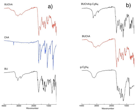 FTIR for the interaction between (a) BU and ChA and (b) immobilization of BUChA over g-C3N4 nanosheet.