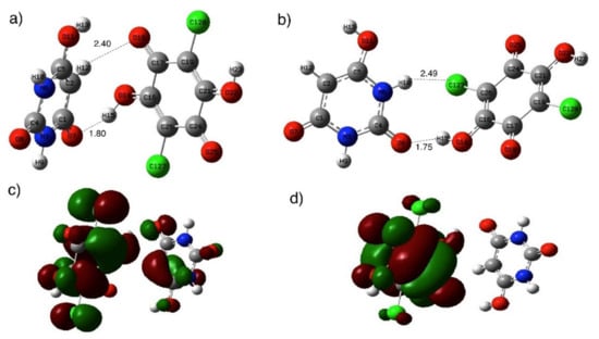 In order to investigate the molecular forces for interactions between BU and ChA, DFT calculations using wB97XD/def2-TZVP level of theory were used. Figure 4 (Tables S1–S4) shows the optimized structures of the most stable BU structure [56] and ChA. The calculated molecular electrostatic surface potential (MESP) of BU showed the presence of negative electrostatic potential (V = −31.4 and −25.1 kcal/mol) over the carbonyl (C=O) groups, while positive electrostatic potential (V = +40.1 and +31.4 kcal/mol) on -OH and –NH groups, respectively [37]. On the other hand, the ChA acceptor shows less negative electrostatic potential on –C=O groups (V =−22.6 kcal/mol) and low positive potential on –Cl and –OH groups, which nominated ChA for accepting electrons. Different orientations of the BUChA (BUChA-I-IV) complex were explored to explore the possible binding between BU and ChA. Figure 5a (Figure S3 and Tables S5 and S6) shows the most stable optimized structure of the molecular complex BUChA-I where short contact hydrogen bonding (HB) between the two molecules stabilized the complex formation. The HB in O7···H15–O14 showed a 1.80 Å bond distance and 148° bond angle, which was 33.8% less than the sum of vdW radius. The short bond distance initiated the proton transfer from ChA to BU to form ChA−···BU+ species. The structure was further stabilized by another weak HB (C2H12···O18, 2.40 Å and 131° bond angle). The binding process could occur through the isomer in Figure 5b (BUChA-II, (Tables S7 and S8), where short HB (bond distance 1.75 and bond angle 153°) in addition to H10···Cl27 HB (bond distance 2.49 Å and bond angle 148°). However, the BUChA-I structure in Figure 5a was more stable by 2.4 kcal/mol than the BUChA-II structure. The solvent effect-using methanol (ε = 32.6) was performed using the SCRF and PCM on the optimized structures of BUChA-I. The results showed the stabilization of the complexes on the methanol (6.9 kcal/mol), attributed to higher charge separation in the excited state [57]. The electronic absorption spectrum of BUChA in methanol was predicted using DT-DFT calculations. Figure S4 shows the presence of the CT band at 570 nm, which was consistent with the experimental CT band, with oscillator strength (f) of 0.012, which was assigned to HOMO → LUMO transition (98%). The HOMO orbitals of the BUChA-I position on both BU and ChA, while only ChA contributed to the LUMO orbitals of the complex (Figure 5c,d), which indicated the π→π* electronic transition from the HOMO of BU to the ChA LUMO.