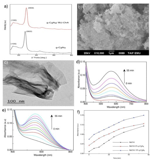 (a) XRD pattern, (b) SEM of g-C3N4, (c) TEM of the g-C3N4 nanosheet, (d) effect of time on the absorption spectra of BUChA, (e) effect of time on BUChA/5% g-C3N4, and (f) Time-absorbance relation in methanol.