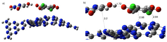 Optimized structure of (a) BUChA/g-C3N4 and (b) enlarged BUChA/g-C3N4 structure in the gas phase.