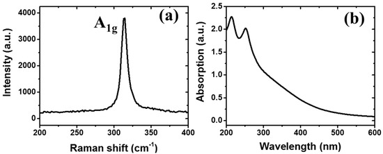 The SnS2 suspension is purchased from Mukenano co., and is made by liquid phase exfoliation method [28]. The Raman spectrum of the SnS2 film is excited by a 488 nm laser and measured by LabRAM HR Evolution (HORIBA JY, France) at room temperature. The measured result is shown in Figure 1a. The peak at 314 cm−1 is the characteristic peak of SnS2 [18]. Figure 1b shows the absorption spectra measured by UV–visible spectroscopy. There are two main peaks of 213 nm and 256 nm in the absorption spectra, as illustrated in [29]. The absorption decreases gradually when the wavelength increases from 252 nm to 600 nm.