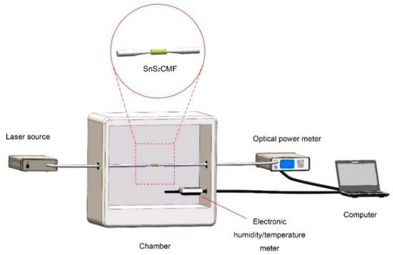 Experimental setup of the SnS2-coated MF device for humidity sensing.