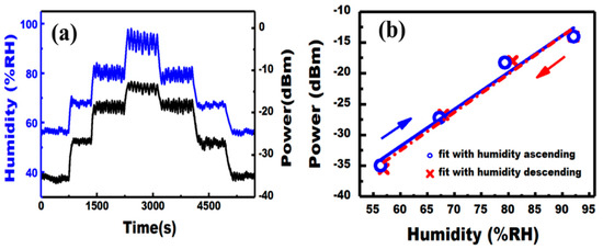 To test the RH sensing property, the RH in the chamber is increased and then decreased with by a step of 13 %RH in the RH range of 55% to 95%. With the change of the chamber RH, the transmitted optical power of MF coated with SnS2 varies accordingly, as shown by Figure 6a. The variation is ~22.5 dB, ranging from ~−35 dBm to ~−13 dBm. The relationship between the transmitted power and the humidity is depicted in Figure 6b. The transmitted power in humidity ascending and descending processes are well overlapped. The transmitted power changes linearly with the chamber humidity. The sensitivity is ~0.57 dB/%RH with the R-square of ~0.98. The high sensitivity and good linearity of the SnS2 nanosheets is appealing in the humidity sensing.