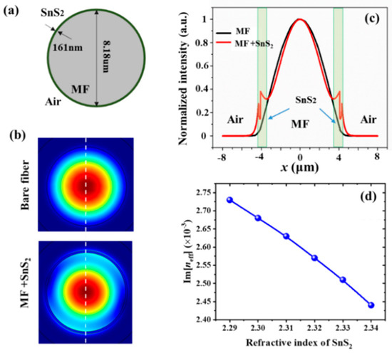To investigate the influence of the SnS2 refractive index on the absorption of SnS2-coated MF, we perform a simulation with COMSOL Multiphysics. The simulated structure is shown by Figure 9a, which is the same as the experimental one. The refractive index of MF and SnS2 are 1.46 and 2.29 + 0.3i [33], respectively. The intensity distributions of fundamental modes with and without SnS2 are shown by Figure 9b. The light field is enhanced and absorbed by the SnS2 film, as shown by Figure 9c. With the increase of the real part of the refractive index of SnS2 film, the imaginary part of effective index of SnS2-coated MF decreases gradually, resulting in the increase of the transmitted power as observed experimentally.