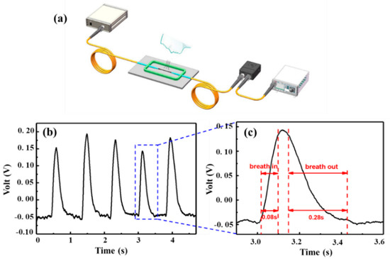 Relative humidity (RH) measurement and monitoring are important for industry, food storage, human comfort, etc. [1,2,3]. In recent decades, various optical fiber devices have been developed for this purpose [1]. The optical fiber sensors show advantages over electronic ones, owing to their long lifetime, corrosion-free, light-weight, electromagnetic immunity, and remote sensing ability [4,5]. Microfiber and side-polished optical fiber are two kinds of optical fibers used frequently in the RH sensing [1]. To enhance the RH sensing performance, certain sensitive materials are deposited on the surface of microfiber/side-polished fiber [6,7]. In 2000, agarose gel was coated on a tapered fiber by Baríain et al. [8]. A transmitted optical power variation of 6.5 dB was obtained with a relative RH changing between 30% and 80% [8]. Recently, two dimensional (2D) materials have attracted increasing attention [9,10,11]. Luo et al. demonstrated an all-fiber-optic RH sensor comprised of a Tungsten disulfide (WS2) film overlaid on a side polished fiber [11]. This sensor has a linear correlation coefficient of 99.39% [10]. Lately, Huang et al. demonstrated a high-sensitivity (0.145 nm/RH%) RH sensor by taking advantage of the swelling effect of graphene oxide film [12]. Du et al. fabricated a MoS2-based all-fiber RH sensor with fast response and recovery [13]. Monitoring human breath is significant for assessing human body conditions, such as cardiac and pulmonary symptoms [14,15]. Many fiber-optical RH sensors have been successfully used for monitoring human breathing [12,13]. However, ultrafast response and recovery times are required in some RH sensing application. As illustrated by [15], the infant pulmonary function testing requires a sampling rate of more than 200 Hz, which is still challenging for fiber-optical RH sensors.