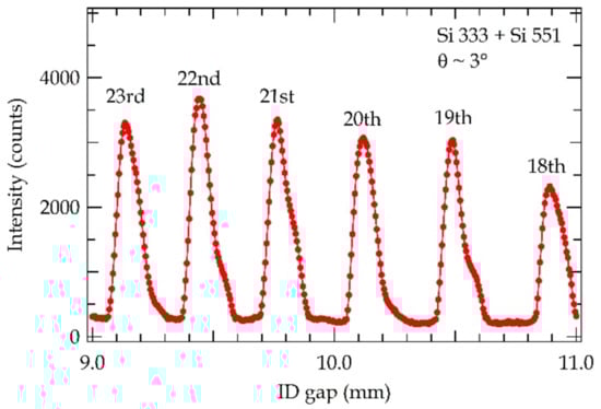In this paper, we detect the spectral change of Compton scattered X-rays due to the momentum perpendicular to the traveling direction in the HG light. Measurements were performed on SPring-8 BL37XU [10] with linearly polarized X-rays emitted from the undulator with a polarization vector in the horizontal plane. Figure 1 shows observed X-ray intensities, which are monochromatized to 114 keV by a Si 333–Si 511 double crystal monochromator, with changing undulator gaps as an example. By changing the undulator gap, a HG mode with a given harmonics number was chosen. In the present experiment, we used X-rays with 18, 19, 20, or 21st harmonics number (order of light) of the undulator. The emitted X-rays were monochromatized to 100 keV (energy width ΔE/E = 2 × 10−5) by a Si 333–Si 511 double crystal monochromator, and irradiated on the sample. The center part of the X-ray was selected by a slit (0.5 mm × 0.5 mm) at the front end (30 m from the light source point). Figure 2 shows the experimental layout. Compton scattered X-rays were detected by a Ge solid state detector with a scattering angle of 90°. The scattering plane was set perpendicular to the linear polarization vector in the present experiment (90°, geometry in Figure 2).