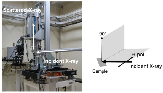 Experimental setup. Incident X-rays (come from the right) with horizontal polarization irradiates a sample. Scattered X-rays are detected with a scattering angle of 90°. The scattering plane is perpendicular to the linear polarization vector (H. pol.), which is shown as 90°.