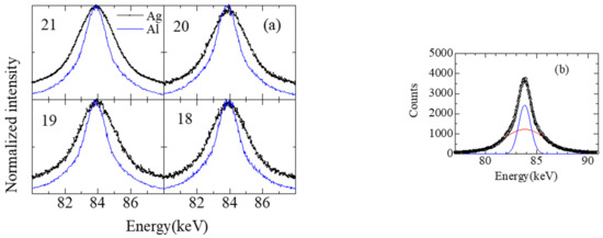 Figure 3a shows the Compton scattering spectra of Ag and Al samples for the incident X-ray with an 18, 19, 20, and 21st harmonic order of undulator. Although the spectral shapes depend on the sample clearly, dependences on the harmonic order of undulator are not clear, as shown in Figure 3a. Therefore, we performed analysis for the Compton scattered X-ray spectra by superimposing two Gaussian fittings. Figure 3b shows an example of fitting results for Al samples of the 21st harmonic order of the undulator. We call the broad FWHM, which corresponds to a momentum distribution of the core electrons, Width_1 (broad), and the narrower FWHM, which corresponds to a momentum distribution the valence electrons, Width_2 (narrow) [11]. Figure 4a shows the harmonic order dependence of Width_1 (broad) and Width_2 (narrow) for Al, Ag and Au. Here, we focus on Width_1 (broad) of Al and Width_2 (narrow) of Al, Ag and Au to avoid BG contributions such as lead fluorescence. The dependences on the harmonic order of undulator for Width_1 (broad) and Width_2 (narrow) are small. However, we seem to catch oscillations of Width_1 (broad) and Width_2 (narrow), as shown in Figure 4a.