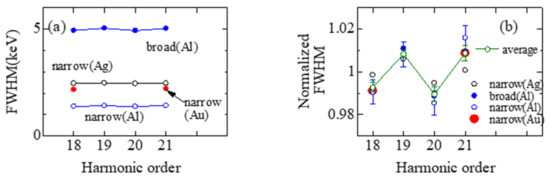Figure 4b shows the Normalized Width_n obtained from Equation (10) for Al, Ag and Au. The oscillation behaviors of Normalized Width_n are observed in Figure 4b. The oscillation behaviors show that the normalized Width_n increases on the odd harmonic orders of the undulator, and decreases on the even harmonic orders of the undulator. This behavior may come from the difference in the node of HG light. The difference of Normalized Width_n between the odd and even order is about 0.01 (1%) on average. Since a momentum perpendicular to the traveling direction in the HG light is reflected by an FWHM of a Compton scattered X-ray spectrum, as discussed in Equation (10), the dependence on the harmonic orders of the undulator for the normalized Width_n can be ascribed to difference of the momentum perpendicular to the traveling direction in the HG light. The order of the value of momentum perpendicular to the traveling direction is estimated to be 1% of the momentum of the incident X-rays.